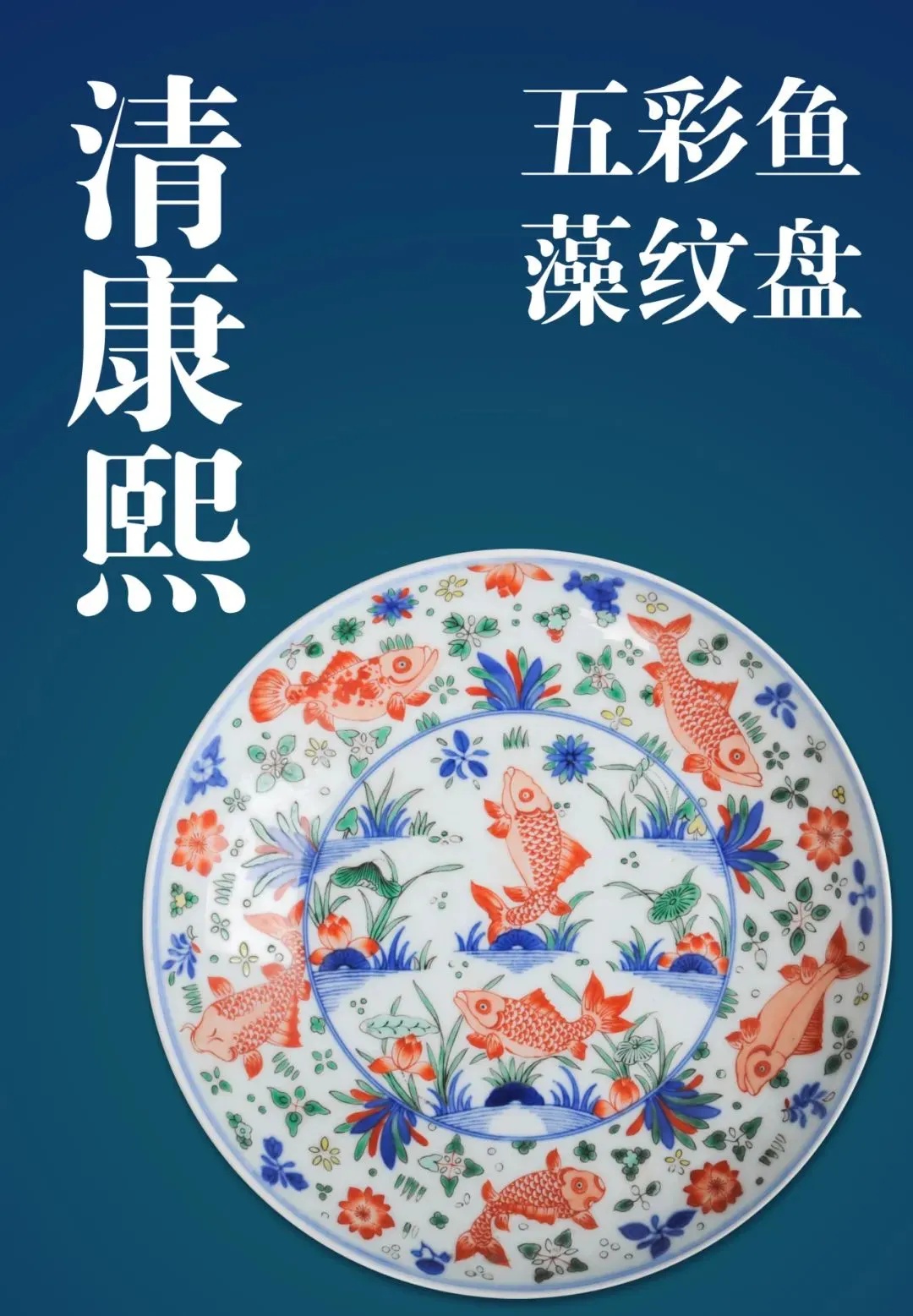 该盘直口微内敛,弧腹,圈足,白釉莹润,盘内所绘的鲤鱼、鲶鱼、鳜鱼、鲫鱼肆意畅游在池莲之中;盘心一鲤鱼在水中跃起,极富动感,而另一尾则悠然自得,游弋在荷莲之间。水草浮萍,漂浮摇曳,衬托出水的动感,鱼以红彩勾腮描鳞,淡红色晕染,黑彩点睛,体态肥腴,游姿各异。有着“富贵有余”、“连年有余”的美好寓意。