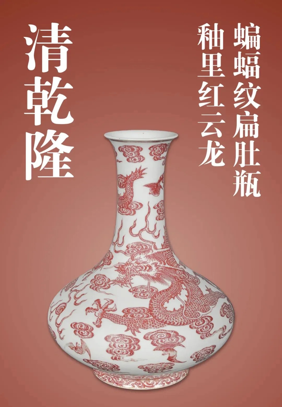 云龙纹,在构图上以龙纹为主,云纹为辅。画面中一龙遨游在祥云之中,一龙昂首在海涛中翻腾而起,双龙均为五爪,空间点缀着飞翔的蝙蝠,寓意吉祥。明、清两代陶瓷器盛行龙纹,乾隆朝云龙纹龙身常扭曲为“弓”字形,其腹部有明显下坠感,加强了云龙的动感,给人一种叱咤风云的威武气魄。在龙鳞的描摹上,采用勾描的方法以加强立体感。