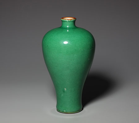 郎窑绿是创烧于清康熙年间的一种铜绿釉,在高温氧化气氛下烧制而成,成品率低,存世量极少,其与“郎窑红”皆因督陶官郎廷极而得名。它呈色浅翠,玻璃质感强烈,也有微绿而泛蛤蜊光的,器身满布小碎冰片纹,有“苍蝇翅”之称。此件梅瓶,器形标致,纤小雅若,器身满施绿釉,开片密布,色泽莹润。