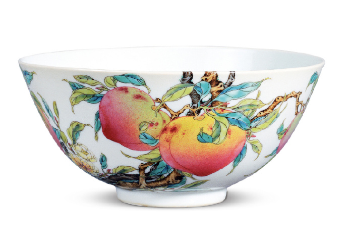 敞口,弧腹,圈足。外壁彩绘一株苍茂的桃树沿碗壁蜿蜒伸展 至内壁。六枚寿桃鲜艳欲滴,两内四外,浑然一体,数只蝙蝠飞于其间。胎质匀净细白。色彩淡雅,层次十分丰富。桃蝠纹寓意为“福寿双全”。 底书青花双圈“大清雍正年制”楷书款。雍正粉彩之精美细腻如此者,恐无出其右。
