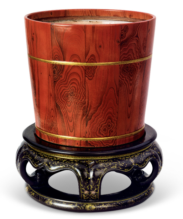 以红褐色、褐色两种彩釉绘制的木纹釉瓷,始烧于雍正时期,乾隆朝尤为流行造型丰富多样。其造型、色泽、质感均与木制器皿酷似,木质纹理清晰,瓷木难辨。邵民在《增补古今瓷器源流考》记载道:“清瓷彩色至乾隆而极,其彩釉之仿他物者亦以乾隆为最多最精。如仿木纹以烧桶,腰有牙箍或铜箍,皆与真木桶无异。”花盆与底座相配,既增加了整体美感,也给人以稳重敦厚之感,集装饰性与欣赏性于一体。