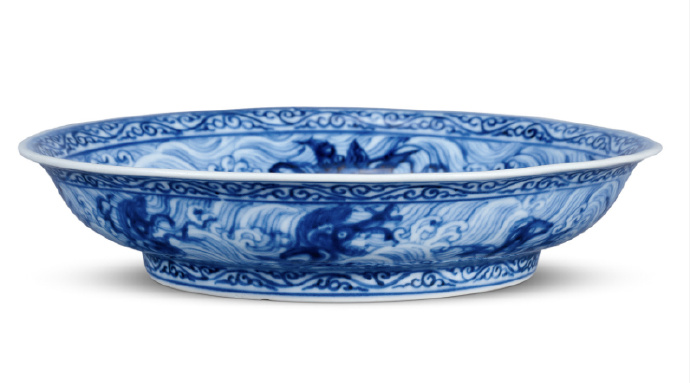 撇口,浅弧腹,圈足。内底绘海水翼龙纹,内壁绘海水异兽纹五头,外壁九头,寓意为“龙生九子”。青花呈色艳丽,略有晕散,仍留有宣德时苏麻离青料的效果,应为成化早期作品。