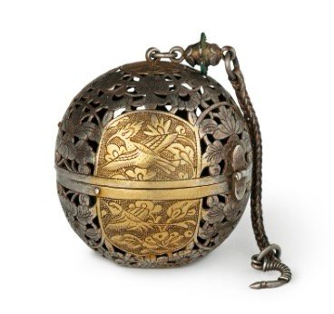 该香囊由两个半球组成,有子母口可以扣合。下半球内装有两个同心圆机环和一个盛放香料的香盂。大的机环与外层球壁连接,小机环分别与大机环和香孟相连。使用时,由于香盂本身的重力作用和两个同心圆机环的机械平衡,无论香囊如何滚动,里面的香盂都可以保持水平状态,香料不会倾撒。香囊外壳通体透雕花鸟纹饰,不仅美观,香气也通过这些镂空散发出来。香囊上有链条,上部有弯钩,这样既方便佩戴身上,也可以悬挂室内帐中。同出共4件,体形大小基本相同,应该是一个人或一个作坊制作的,年代至晚在8世纪中叶。