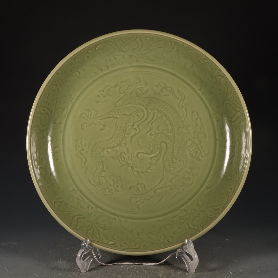 龙泉梅子青釉刻花龙纹窝盘