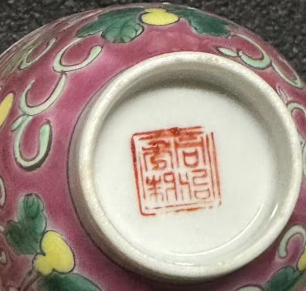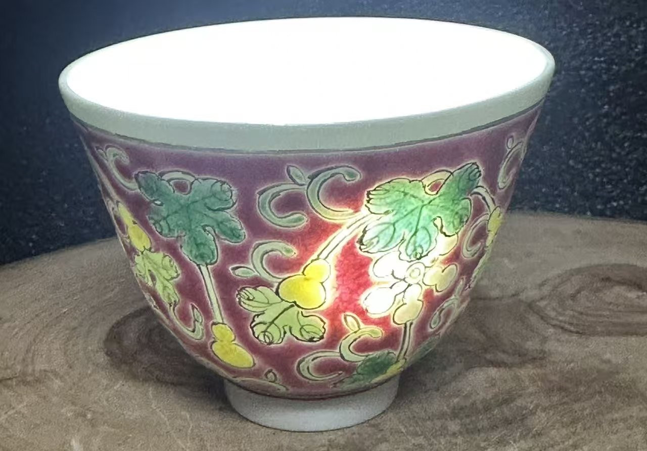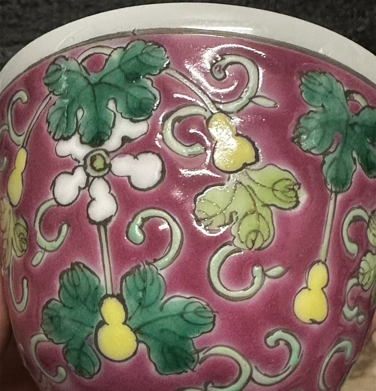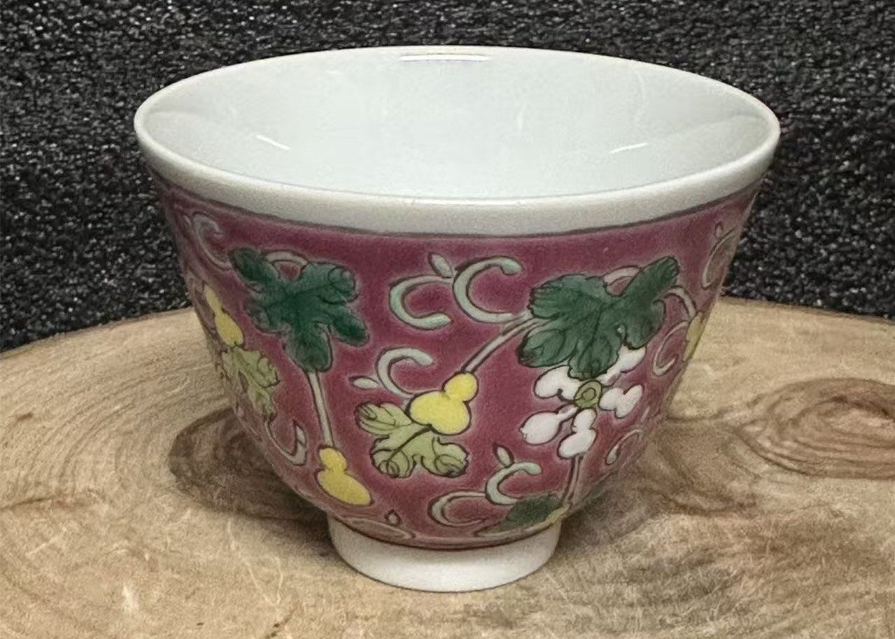稀有满工重工粉彩胭脂红釉缠枝莲花纹主人杯保存完好釉色肥厚手绘画工精精细胎