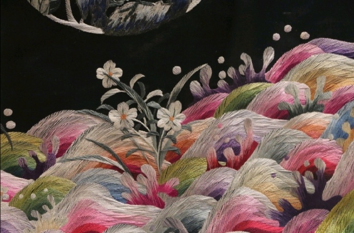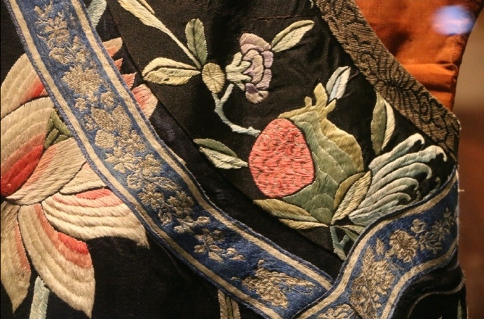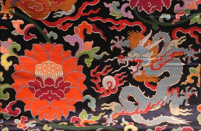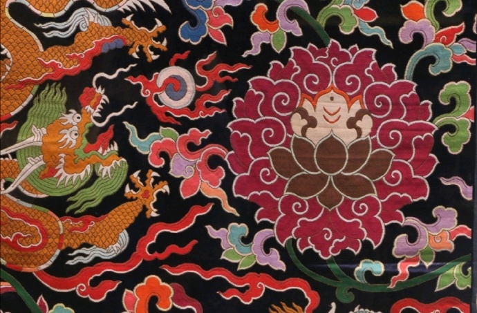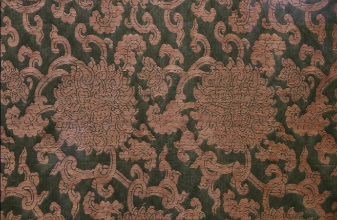 牡丹花硕大而娇艳,瓣肥圆曲,层层围拢,呈现出一种豪门富贵的气派,位居群芳之首,素有“花王”之称,被誉为“国色天香”。唐代之前,并无牡丹之名,它是由芍药培育出来的一种名花,主要供观赏之用。自此以后,成为诗人画家乐于书写、描绘的题材。在云锦的图案中,表现牡丹的纹样也特别多,各种形式都有。这样的选择并不是偶然的,而是华贵富丽的一种合韵。
