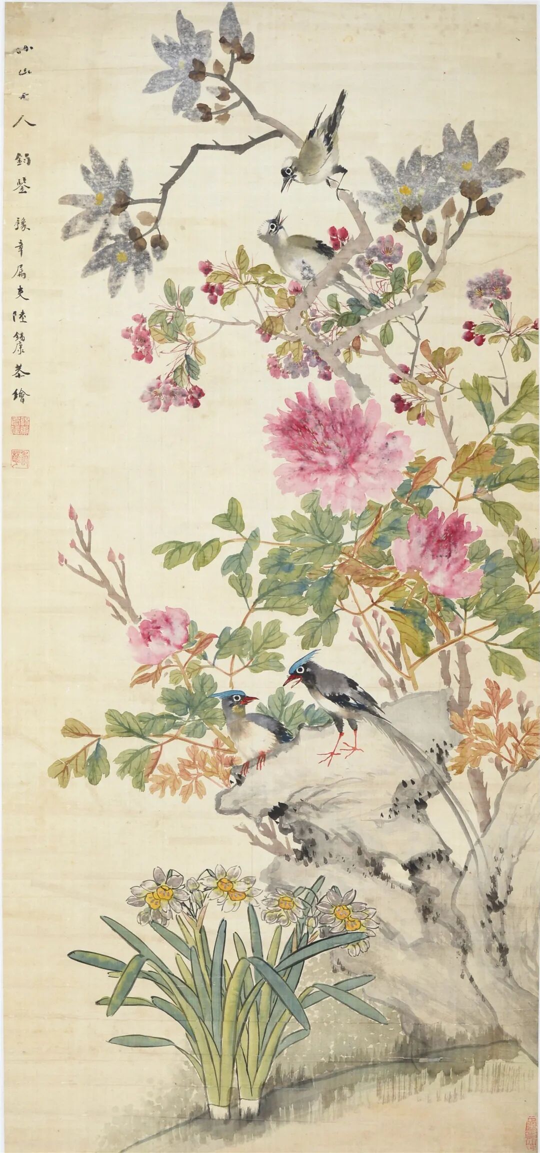 牡丹与其他事物组合,寓意丰富多彩。牡丹与白头翁组合,寓意“富贵白头”,用于祝福老年人富贵长寿;与绶带鸟组合,寓意“富贵长寿”;与凤凰组合的图案被称为“凤戏牡丹”或“凤穿牡丹”,寓意“富贵吉祥”,可用于婚嫁,象征美满幸福;牡丹与孔雀结合寓意“富贵吉祥”;与公鸡组合在一起寓意“功名富贵”;与海棠花组合,寓意“满堂富贵”;与水仙花组合,寓意“神仙富贵”;牡丹插在瓷瓶内寓意“富贵平安”。