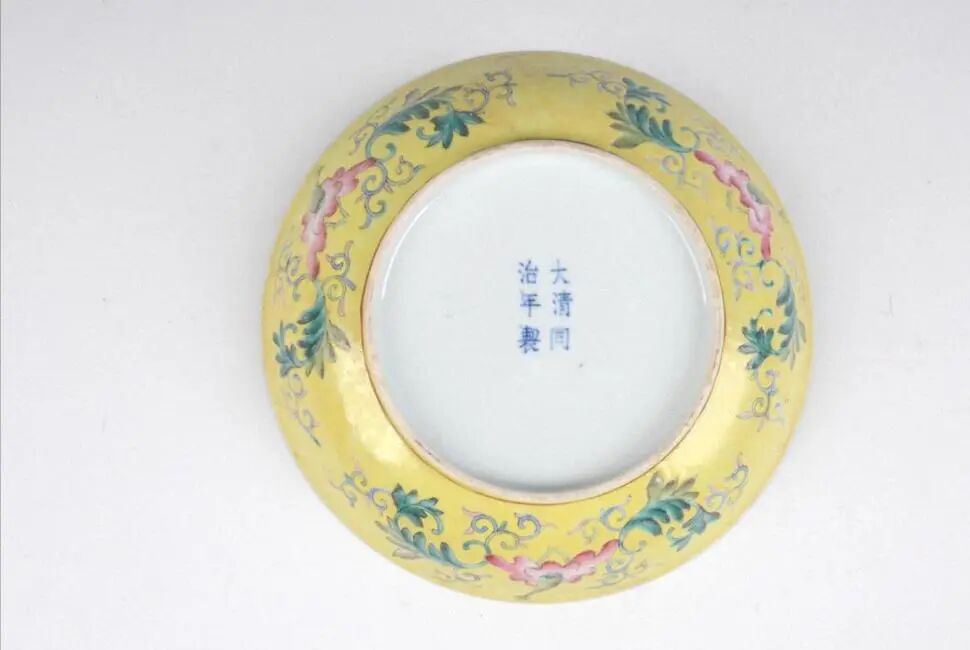 清“大清同治年制”款黄地蝠寿纹盘