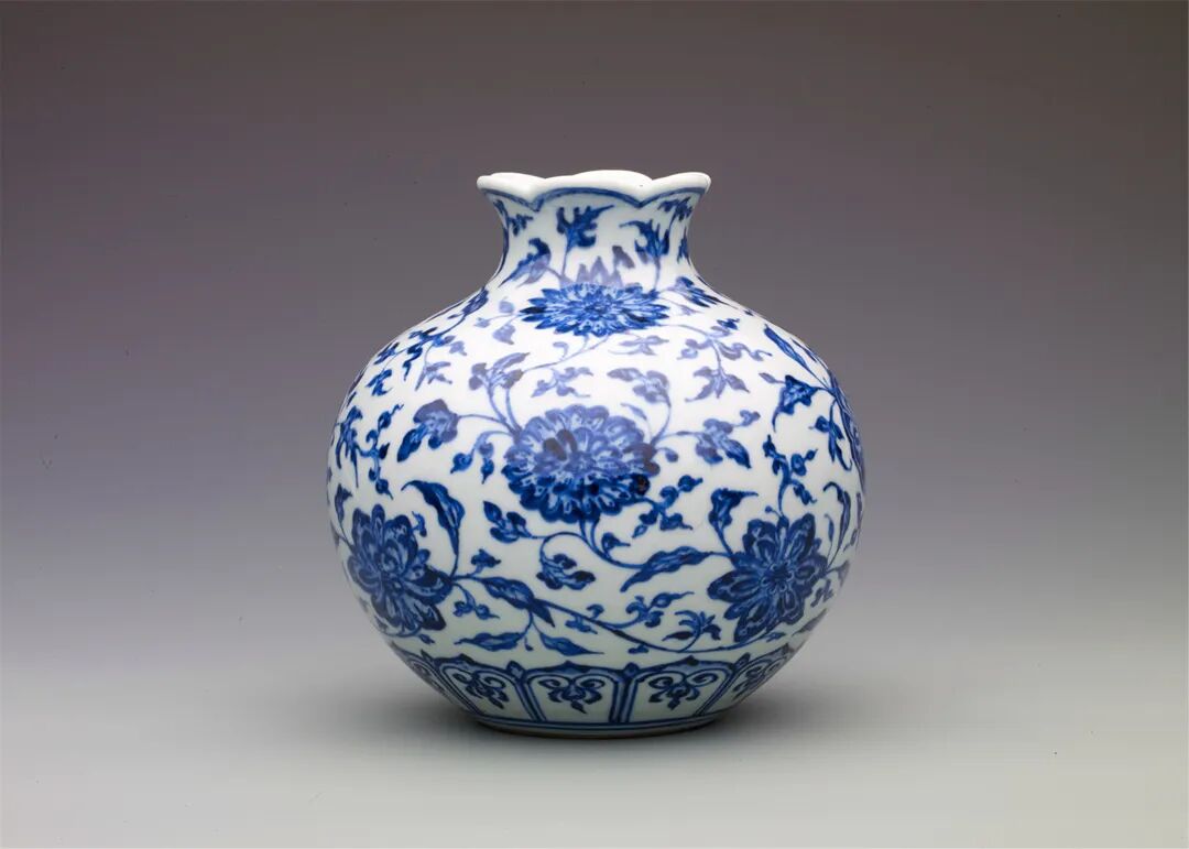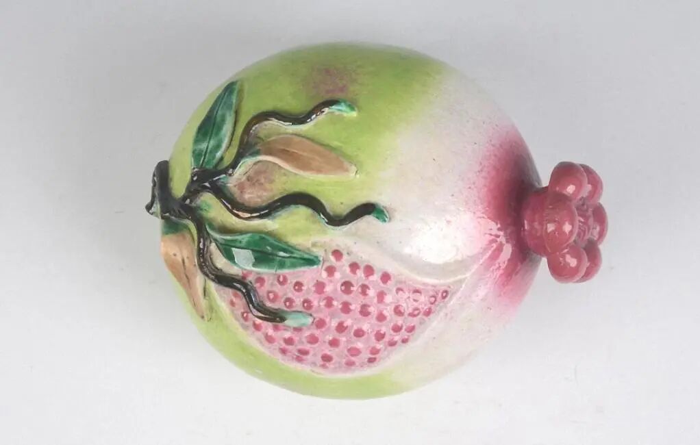 石榴纹始见于唐三彩,一直以来都较为盛行,被广泛运用于陶瓷、金银器、玉器、壁画、织锦等领域。装饰手法主要为模印贴花和刻花施彩。纹样形式主要是绽放的花朵簇拥着饱满的石榴果实,有的是花苞中布满石榴籽。常与蝙蝠、蝴蝶、葡萄等纹样组合呈现。除此之外,有一种瓷器器形叫“石榴尊”,因其圆腹短颈、口部外卷,形状如同石榴而得名。始见于明宣德时期,主要流行于清代雍正、乾隆时期,制作水平和品质最高。品种有青花、窑变釉、粉青釉、茶叶末釉等。