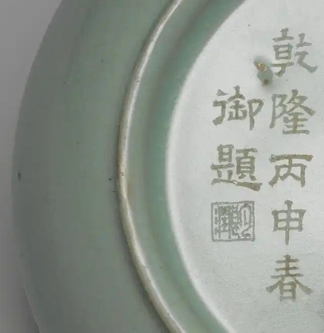 底刻乾隆皇帝〈咏汝窑盘子〉:「赵宋青窑建汝州,传闻玛瑙末为油。而今景德无斯法,亦自出蓝宝色浮」御制诗。