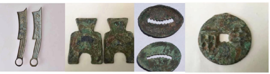 从左到右依次为刀币、布币、贝币和半两
