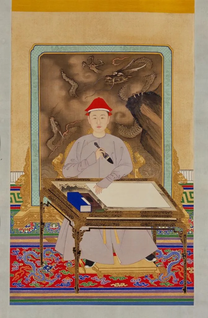 康熙帝身后的墨龙图屏风彰显着帝王尊贵的地位