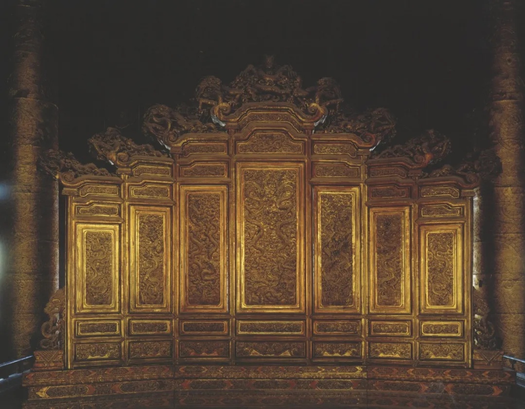 金漆雕云龙纹屏风共七扇,高度自中间一扇向两边递减,七扇屏风之上合计雕九龙,为阳极之数,屏风工艺精湛,雕饰华丽,是皇权威仪的体现。内廷之主的乾清宫陈设的是五扇金漆雕云龙纹屏风,其造型与太和殿的类似,但等级稍减。