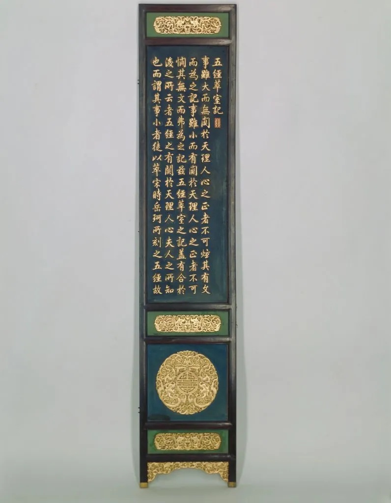 屏风上的文字以金丝楠木锼刻,表面再施以泥金工艺,使文字凸起略高于漆地。这种工艺也被称为识文描金,“识文”即凸起的花纹,因花纹高高堆起,形成华美的装饰效果。