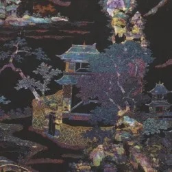 清代剔红边框嵌螺钿山水挂屏,其两件成对,正面屏心皆用五色薄螺钿嵌成山水图,亭台楼阁坐落于湖面,细致入微,螺片颜色不同,根据画面需求,点缀于不同地方,山光水色借螺钿之缤纷,展现得淋漓尽致。