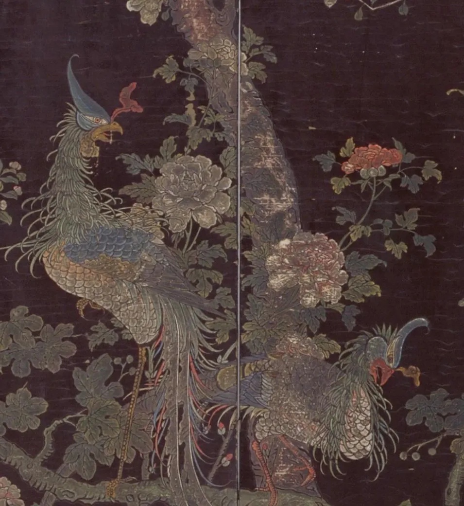 清早期黑漆款彩百鸟朝凤图围屏(局部)