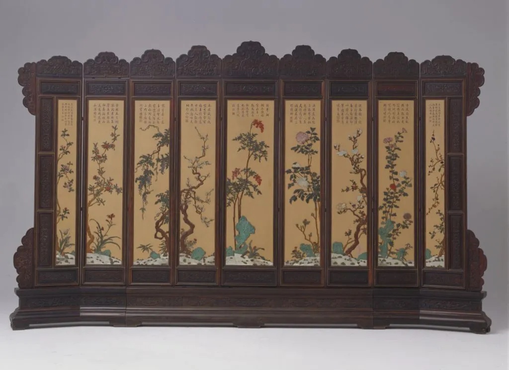 屏风是手工艺与书法、绘画结合的典范,在室内陈设之中,屏风是绘画和书法作品最好的载体,其甚至可以突破二维平面的限制,在一定程度上塑造三维的效果。多种漆器工艺应用于屏风,为其提供了更多的可能性,丰富了屏风的种类与面貌,也促使清代屏风艺术的发展达到了顶峰。