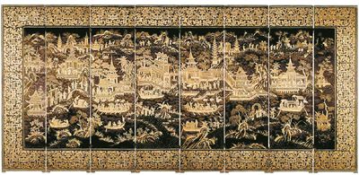广东省博物馆的漆器精品《木胎黑漆描金龙舟竞渡图八围屏》。这件屏风纵215.5厘米,横448厘米,是一件木胎八围屏风,通体双面髹黑漆描金。