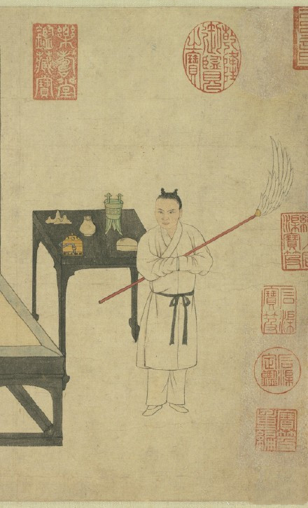 图中一共画了三个人物,画面居中坐在榻上的正是倪瓒,他的左右两侧各是一个仆人。右侧一位小童,左侧一个侍女。仔细观看两个仆人手里所拿器物,我们便会联想起倪瓒的洁癖来。右侧小童手持一把大大的羽毛扇,这可以给倪瓒扇风,自然也可以扇去灰尘;左侧侍女左手拎一个水壶,右胳膊上挎了一条长长的白毛巾,右手托了一个接水用的水盆。这些东西无疑方便了倪瓒随时盥洗。