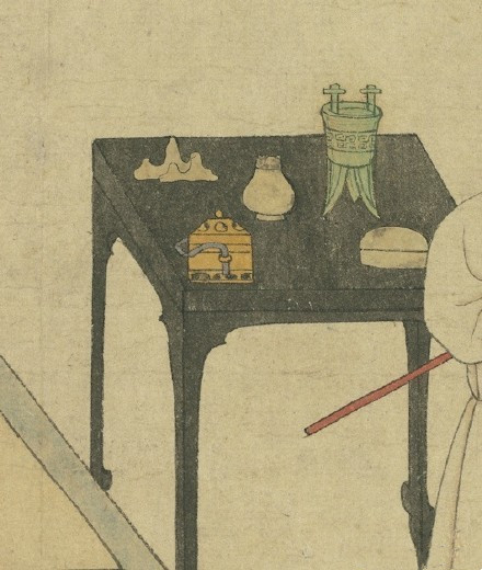 画面中的那些器物和陈设,表现出了倪瓒的高雅风格。案头的笔山、青铜和熏香都是文人家里常见的典雅陈设。倪瓒手中的书卷和毛笔也正好反映了倪瓒的书画人生。