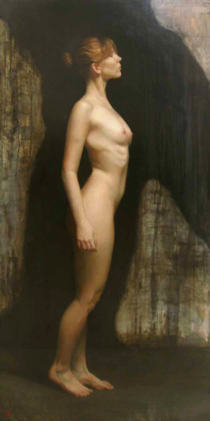 这幅画是大卫·乔恩·卡桑 (David Jon Kassan) 的作品《在静默的观察中站立》。这幅画是一幅现实主义的女性裸体画。 卡桑是一位美国画家,以其逼真的人物肖像画而闻名。