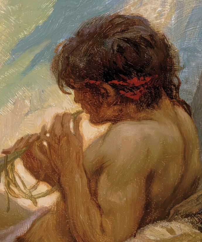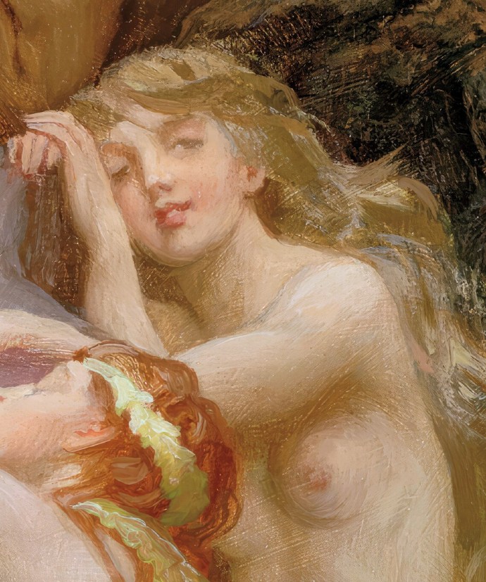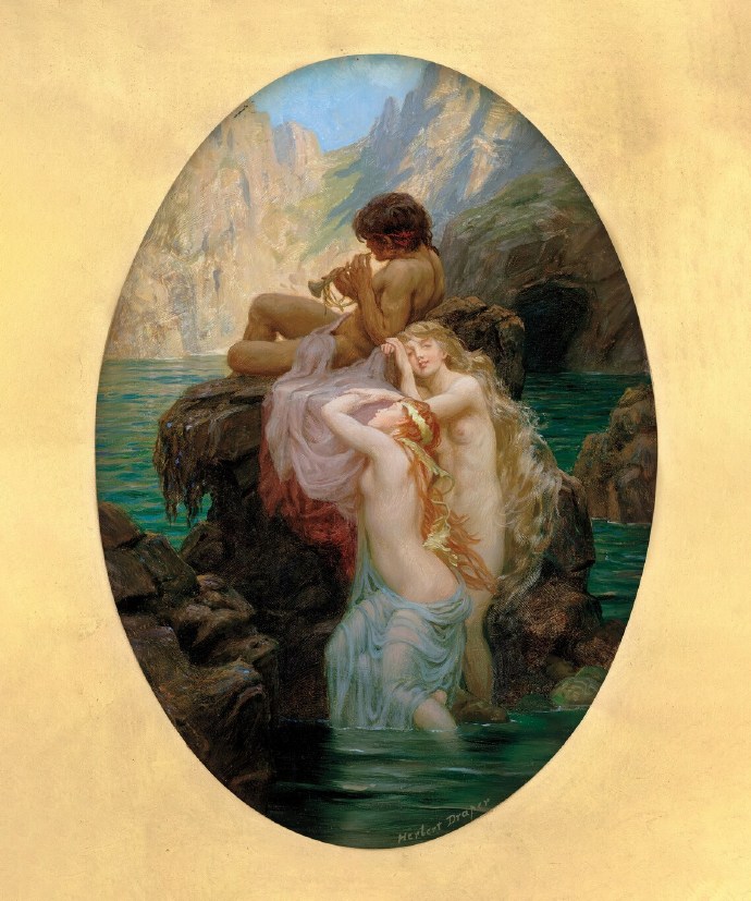 《海之旋律》(Sea Melodies)是英国古典主义画家赫伯特·詹姆斯·德雷珀(Herbert James Draper)于1904年创作的代表作,曾在皇家艺术学院展出。这幅椭圆形油画以浪漫梦幻的海洋神话为主题,描绘三位优美的海之仙女(nymphs)在岩石峭壁与湛蓝海水间,沉醉于神秘旋律。一位半人半兽的男性形象(可能是海神或萨提尔)坐在高处吹奏排笛,音符仿佛与浪花交融;下方两位赤裸的仙女相拥,一位红发女子慵懒倚靠,表情迷离陶醉,充满感官美与诗意氛围。德雷珀以精湛的学院派技法,展现光影在肌肤与海面上的细腻流动,营造出神话般的迷人梦境。