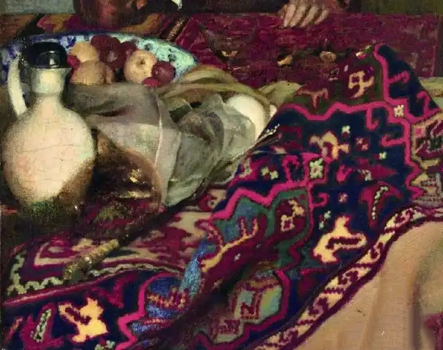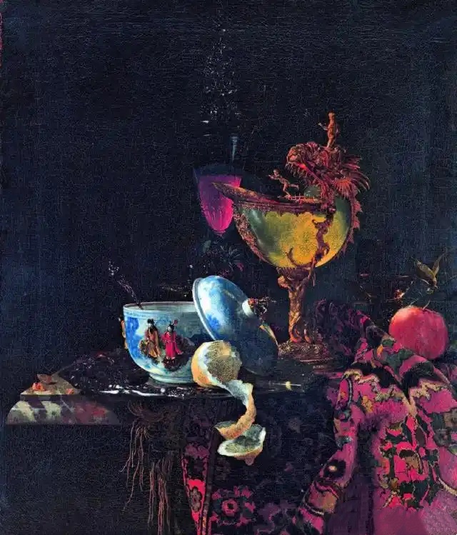又如《有晚明姜罐的静物》同样流露着浓浓的奢侈风:威尼斯透明玻璃杯、镶金高脚装饰瓶、明青花姜罐、银制雕花托盘以及从地中海进口的桃子和柠檬。这些物品被集中铺陈于一张图案繁复的波斯地毯之上。
