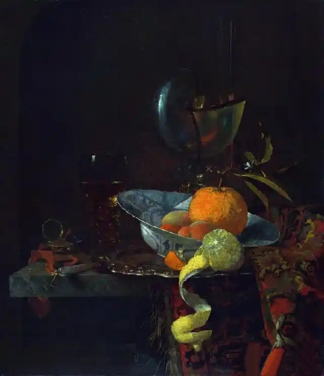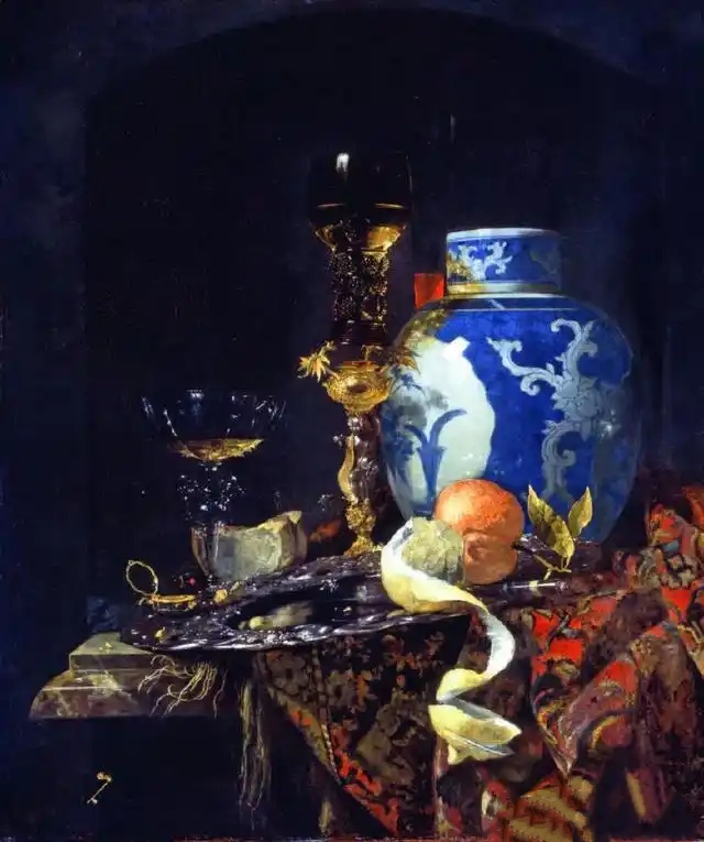 维米尔对青花瓷的痴迷并非孤例。荷兰画家威廉 · 考尔夫的静物画中,也总能找到青花瓷的身影。