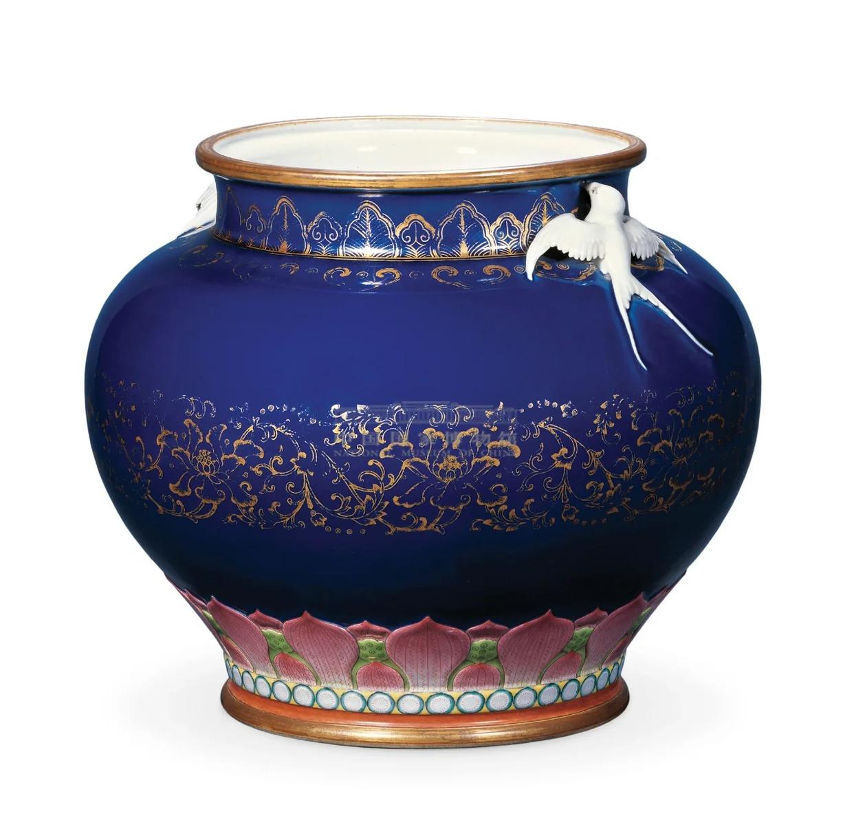 霁蓝色象征河清,燕子与“晏”谐音,整件器物寓意海晏河清、四海承平。乾隆时期的粉彩瓷器工艺达到高峰,品种丰富,装饰技法多样,绘画水平高超,器型精美,这件瓷尊正是这一时期工艺的典型代表。