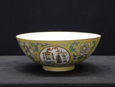 (故宫博物院藏粉彩开光博古图碗)
