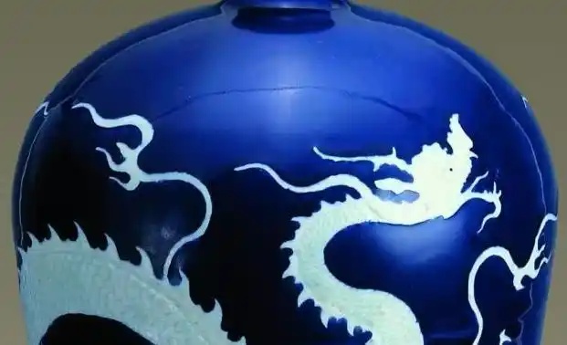 这件瓷器也是蓝釉,与青花的主要成分氧化钴相同,但制作工艺却大不相同。蓝釉堆白是先在素胎上堆塑出纹饰,再进行雕刻。例如,我们看到的这件梅瓶上的龙,就是先用白瓷堆塑出来,然后在龙以外的部分施上氧化钴料,经过高温烧造。