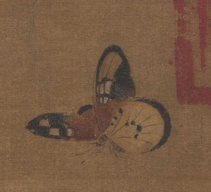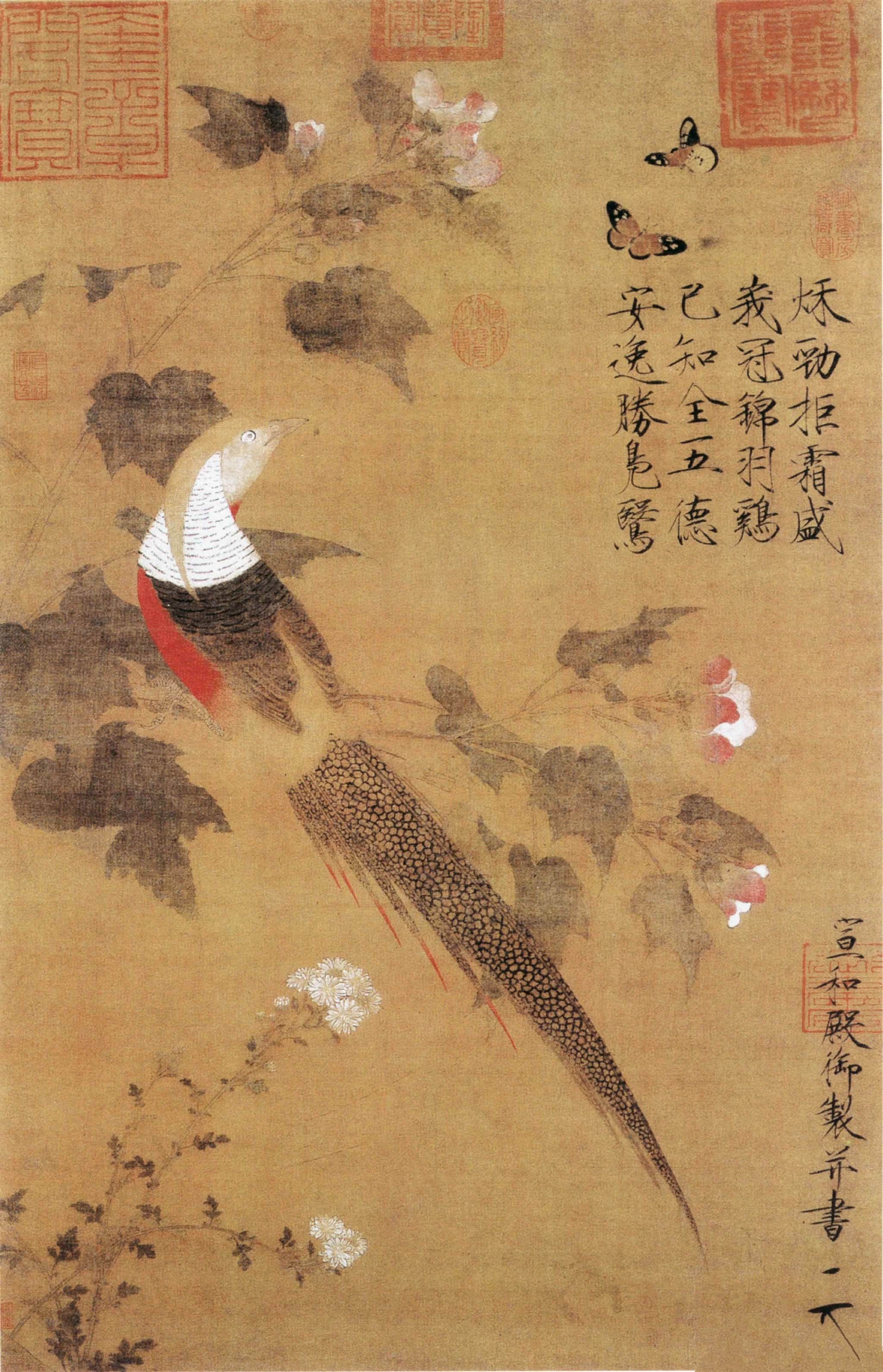 再综观《芙蓉锦鸡图》全幅,可见其构局之美、之严谨。任何一部分甚至一枝一叶,一笔都不顺移易,稍微动一下,就会破坏全局的美,打破了平衡。全幅的气局成了有机的统一,有封有逸,有总的流势,向上向右上角引领生发。如上面的飞蝶高于左边最高的花头,则气就会压抑,现在相反,是芙蓉花头高过飞蝶,因此气势更斜贯带入右上角。其精微博大处如此。同样钤印“御书”朱文方印,是在“宣和殿”三字之上,这种徽宗画的体式,也一点不占画面,不减损那种恒美,相反却为之生色。如此来看,徽宗画的艺术风水也可领略品味了。至于借物喻意,抒写情怀,芙蓉秋菊的傲霜,锦鸡的“全五德”,又在画中画外寻了。
