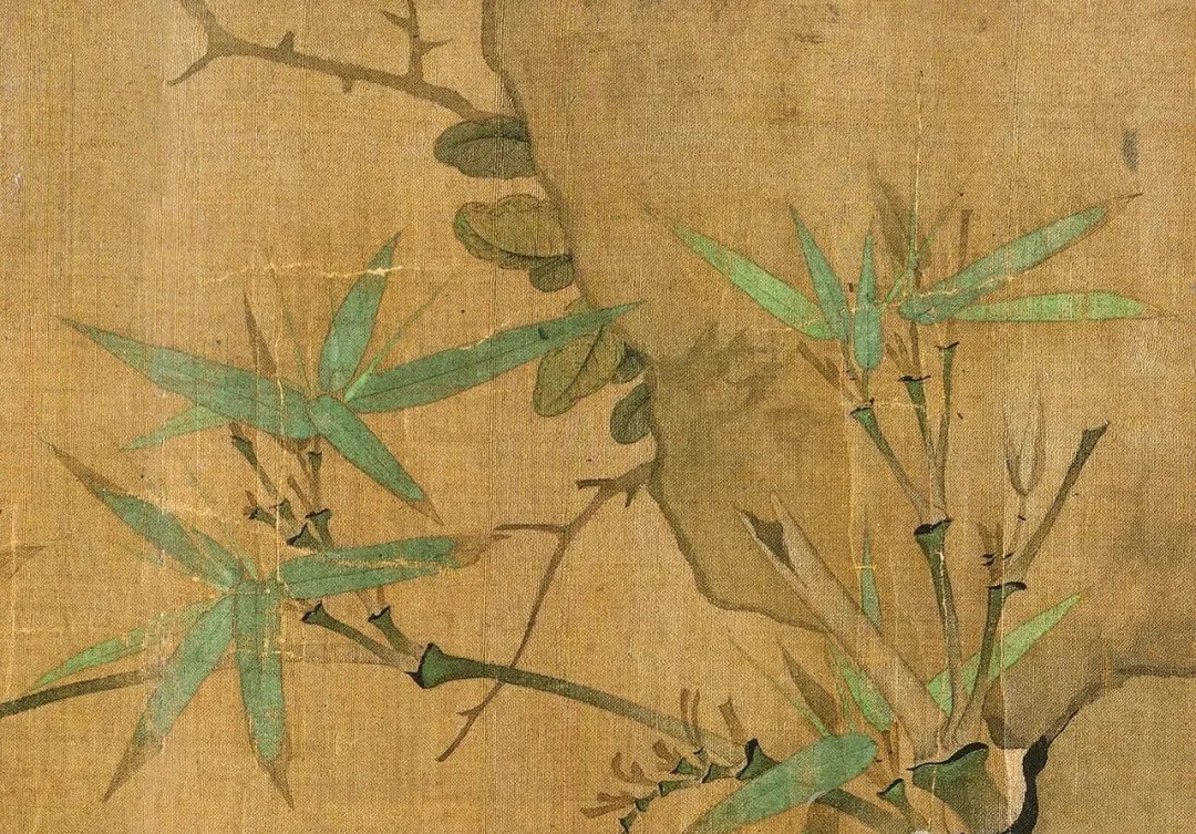 翠竹下面的还有一丛荆棘。一上一下的竹枝上停着两只小鸟。下面的那只鸟侧对着人们,它仰着头在看上面的那只鸟。上面的那只鸟腹部正对着人们,头向右侧着,它回望着下面的那只鸟。两小鸟目光相对,互相顾盼,仿佛就差嘴巴一张一合鸣叫的瞬间了。这两只小鸟是画面的主角。看着它们就使人想起杜甫的那句“两个黄鹂鸣翠柳”。不妨换一下,“两只小鸟鸣翠竹”。