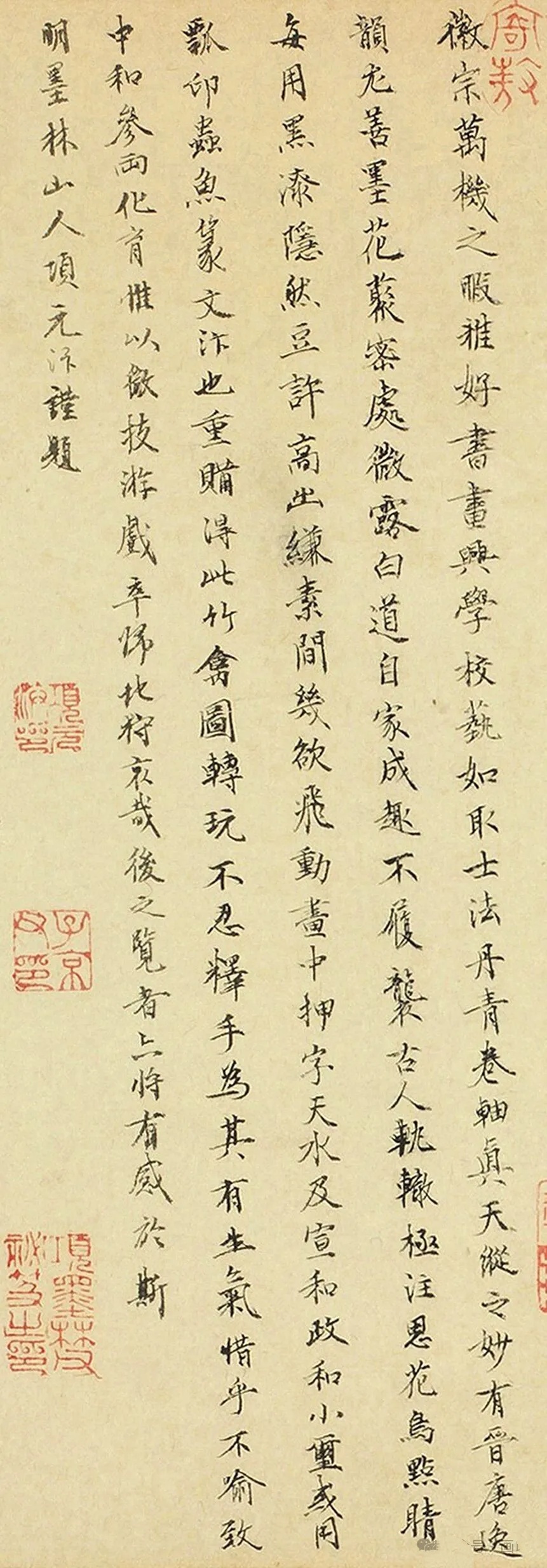 项氏在这一题跋中对徽宗的绘画技巧给予了高度评价,并感叹其作为皇帝醉心书画而不理国事最终导致国破家亡,可悲可叹。其实,项元汴这一题跋的前半部分多是抄录元代《图绘宝鉴》卷三《宋》里面的内容。