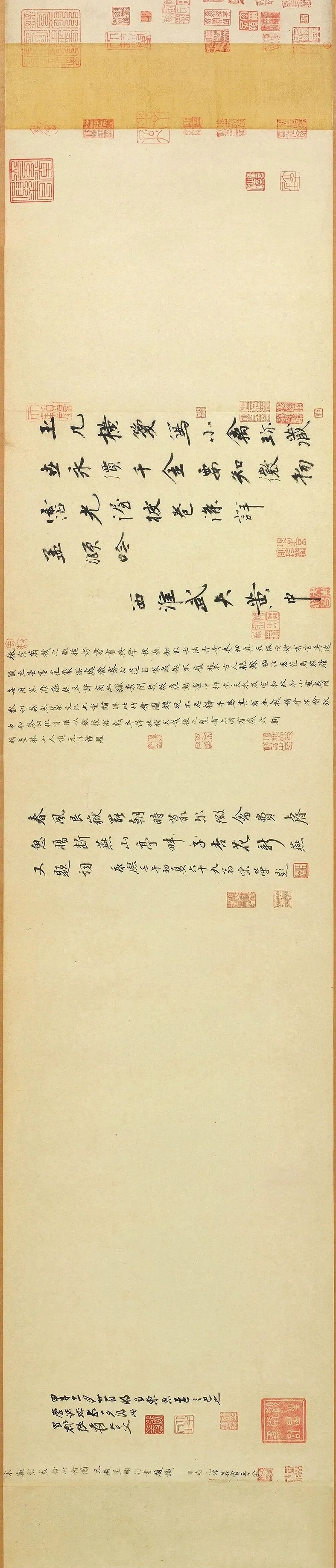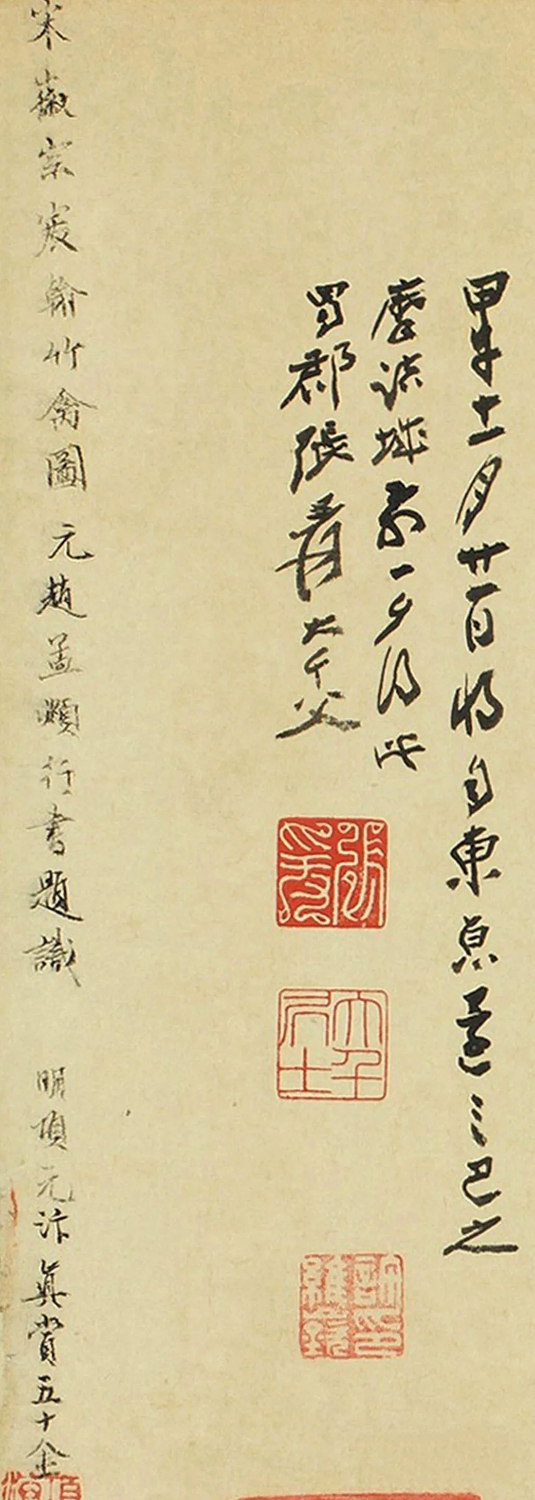 赵孟之后,这幅画卷被收藏黄中。黄中史书上留下的资料非常少。黄中,字彦美,杭州人,自称西淮武夫,陶宗仪颇欣赏其书法,赞“草亦尚可”。黄中是迈里古思帐下的一名将军,在迈里古思被拜住杀害后,黄中临危不乱,率部击败拜住的“台军”,屠戮其全家,擒拿拜住,终为迈里古思复仇,“一时称诵”,杨维桢、刘炳、王逢皆作诗以褒其忠义。
