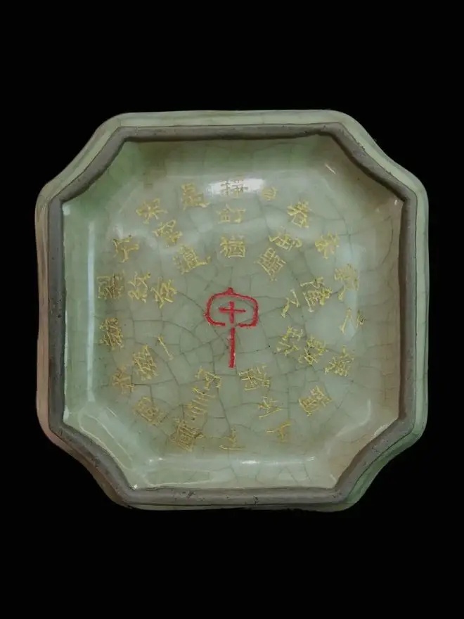 特征:此碗为宋代官窑瓷器,口径:12厘米,底径:9厘米, 高:5.5厘米。造型别致,呈八方形,线条简洁流畅,规整中见精巧。碗身施青釉,釉色温润,呈现出柔和淡雅的色调,似玉般细腻。釉面布满自然开片,裂纹纵横交织,形成独特的冰裂纹效果,深浅不一的纹理相互映衬,别具韵味。底部有红色款识,周围环绕金色御题诗,为其增添了浓厚的文化气息与皇家风范。