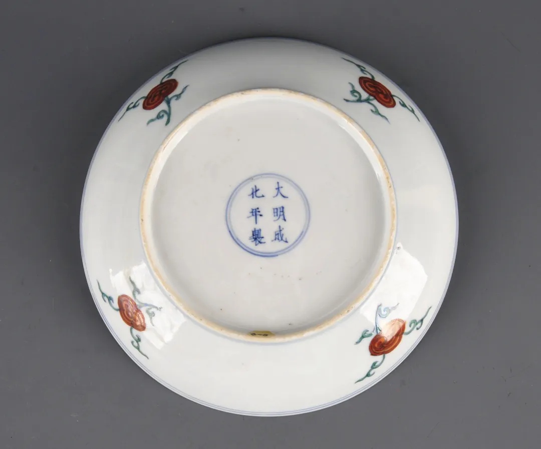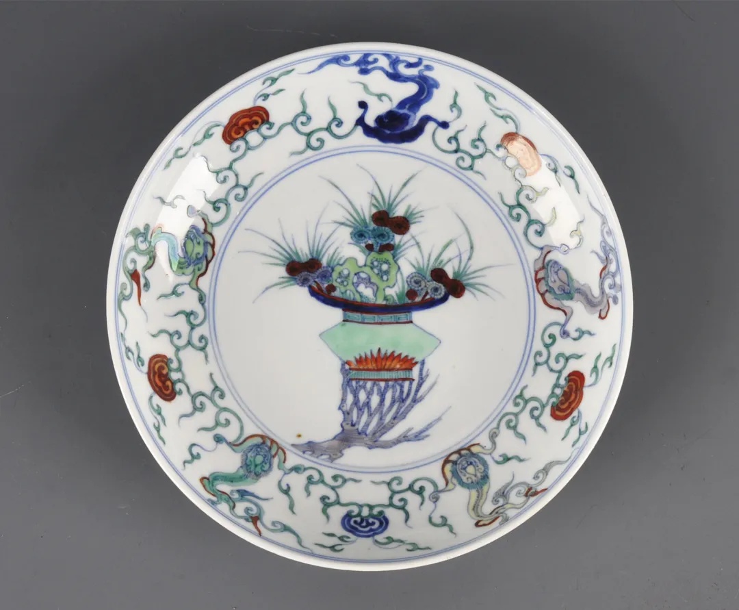常熟博物馆藏清雍正斗彩灵芝盆景纹盘,敞口,弧壁,圈足,直径20厘米、高4厘米。先以淡描青花勾出纹饰轮廓线,再填以各色细润的材料,施彩薄而浅淡,填彩准确,绘画精工。盘心青花双圈内绘斜出的随形树桩承托一个翠绿色花盆,盆内湖石、灵芝和香草错落有致,显得生趣盎然。青花双圈外,夔龙、灵芝间隔排列,空白处以缠枝忍冬纹勾连。盘外壁绘四组灵芝图案,底部双蓝圈内落“大明成化年制”六字两行青花楷书款。