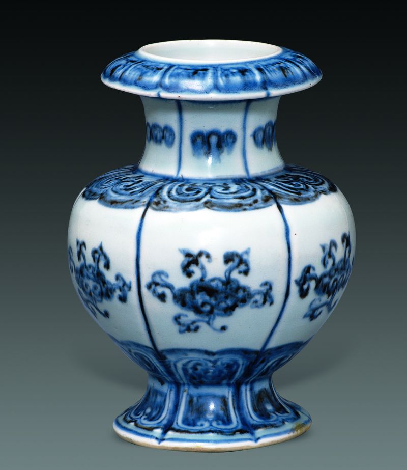 明 高18.7厘米 口径6.2厘米 足径9.5厘米 器因形似石榴而得名。通体呈六瓣瓜棱状,直口,折沿,直颈,鼓腹,高圈足外撇,台阶式内底。通体青花装饰,折沿处绘莲瓣纹,颈绘圆圈纹,肩绘变体莲瓣纹,腹绘折枝灵芝纹,近足处绘仰覆莲瓣纹,外底青花双圈内书“大明宣德年制”六字二行楷书款。 灵芝被视为益寿延年的仙草,能驱病降邪,在瓷器装饰纹样中广泛使用,以象征祥瑞。石榴尊造型别致,是明代宣德时期创新器型,以青花制品为主,流行于清代,康熙、雍正、乾隆时期制品水平较高,且品种十分丰富,除特意仿制宣德青花器外,尚有釉里红、天青、豆青、天蓝、霁红、仿钧釉等制品,大部分书有本朝年款。