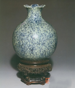 胎质坚致细白。石榴形,五瓣花口外撇,束颈,圆肩,圆腹,卧底假圈足。通体采用钴彩料为着色剂,釉面花纹犹如洒落的蓝色的水滴,故称“洒蓝”,又名“雪花蓝”、“青金蓝”。由于洒落的钴料深浅不一,釉色形成了青、蓝、白错落有致的斑点,似青蓝中飘洒点点雪片,颇为可爱,并富有动感。外底书“大清雍正年制”青花六字三行篆书款。