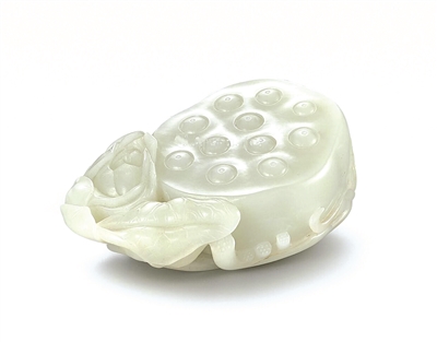 清乾隆青白玉荷花莲房镇纸(图3),青白玉质,透青厚润,圆雕莲蓬荷花,莲蓬浮雕十一籽,莲子顶上管钻浅孔仿莲尖,十分像生,莲蓬下浮雕荷叶莲茎缠绕,莲茎截面钻七孔,莲蓬一侧雕荷花一朵,花瓣肥硕层迭,瓣尖阴刻经脉,一丝不苟,荷叶翻转,背面浅浮雕叶脉,几若实物。乾隆平定准格尔部之后,和田玉料源源不断输入中原,且为官方名义上垄断,故而清宫一时得以制作大件玉器。此件玉雕莲蓬,体量硕大,应为乾隆时期拓土新疆之后的作品。清一代上至宫廷,下至民间皆喜谐音吉祥题材,莲蓬多籽,入题玉器则有多子多孙的寓意。
