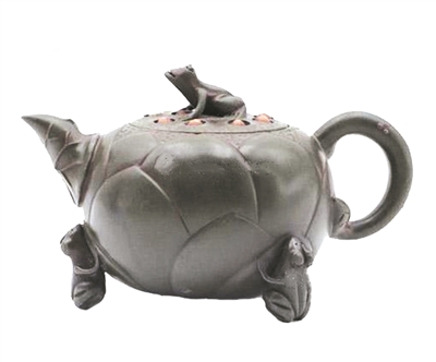 蒋蓉款荷花莲子紫砂壶(图4),以一朵荷花为壶的主体,环绕托起壶身,欲动非动,青蛙、荷花相映成画,可谓是“画在壶上,壶在画中”。壶柄为一莲茎,以翻卷荷叶为嘴,与壶身相呼应,形体线条圆润流畅,莲蓬肥美端庄,无不体现蒋氏的高超技艺。荷花的花瓣,荷叶的经脉都流畅自然,上方以莲蓬作壶盖,壶盖上有一只栩栩如生、活灵活现的青蛙,正张口瞪目,寻觅食物,以此青蛙作壶钮。壶底落有“蒋蓉”二字款。整个作品造型周正,线条流畅优美,趣味盎然。所选泥料色泽醇厚稳定,神韵俱佳,当为紫砂艺术精品。