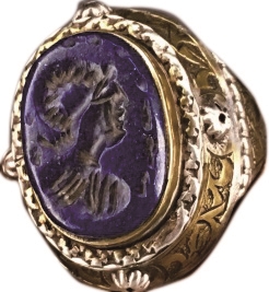 图2即为公元前288年—公元前281年的古希腊时期亚历山大大帝的部将色雷斯王利西马柯斯铸造发行的金币正面图案,就是亚历山大大帝的公羊角头像,此币是希腊化时代最著名的首例神话人像币,头像上的公羊角就象征着亚历山大访问埃及锡瓦阿蒙神庙祈求神谕,自称是太阳神阿蒙之子的身份的象征,更是象征希腊和埃及的复合神宙斯阿蒙。这枚钱币最引人注目的特点是亚历山大炽热的目光。这种钱币在历史上的希腊化地区影响巨大,而大夏(巴克特利亚)正是位于亚历山大帝国的东部,即现在的阿富汗一带。那枚戒指上面青金石戒面上刻的形象,就是来源于此。