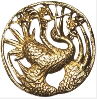 这件清代银饰,重2.5克,直径3.5厘米。图案为一只仙鹤,口衔梅花花枝,鹤首昂然向天,凌空展翅飞翔,在梅花侧旁向空而上,动态十足。梅花花枝繁花朵朵,迎风怒绽。该银饰的手工艺制作为镂空、錾刻、剪片、修边、鎏金等。
