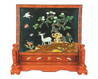 百宝嵌工艺出现于明代,它是在螺钿镶嵌工艺的基础上加上象牙、珊瑚、宝石及玉石等材料形成的镶嵌工艺,用百宝嵌成的图案花卉会随着光线照射角度的变化,发出各种各样的光彩。
