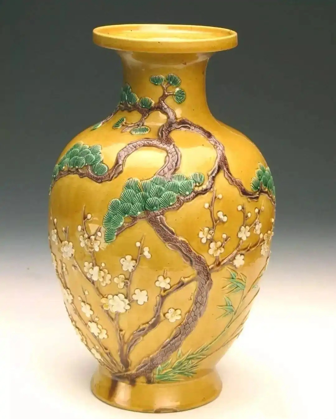 清康熙款黄釉凸雕松竹梅三彩瓶