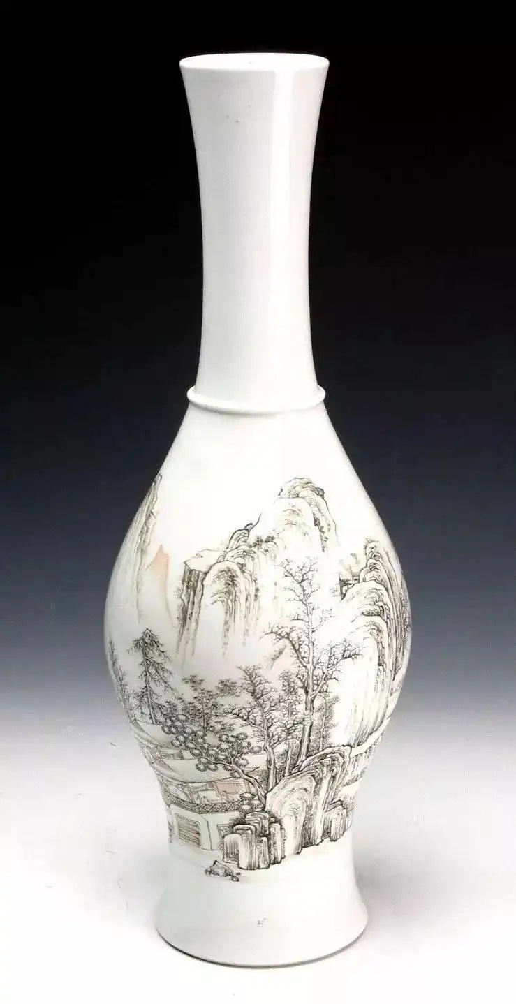 清雍正款墨彩山水人物长颈瓶