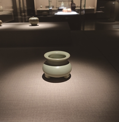 这是一件展陈于福建省世茂海上丝绸之路博物馆的金代钧窑月白釉三足炉(见图),圆唇,短颈,圆腹,下承三足,造型规整大气,工艺精湛细致。该器表面施月白釉,施釉均匀,温润可人,淡雅素净。