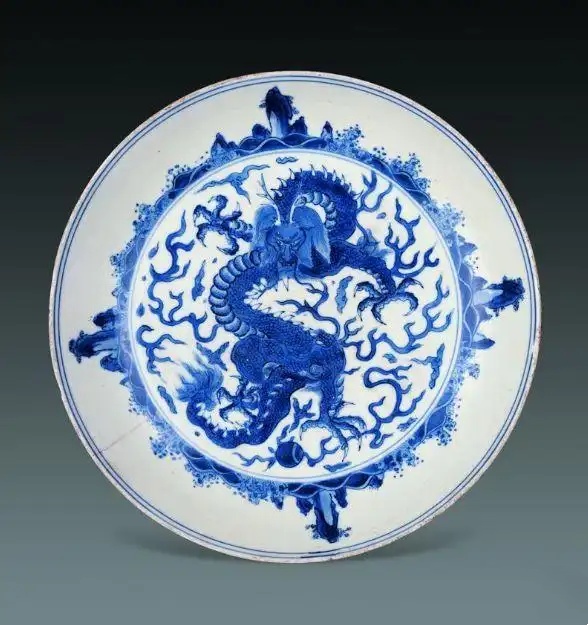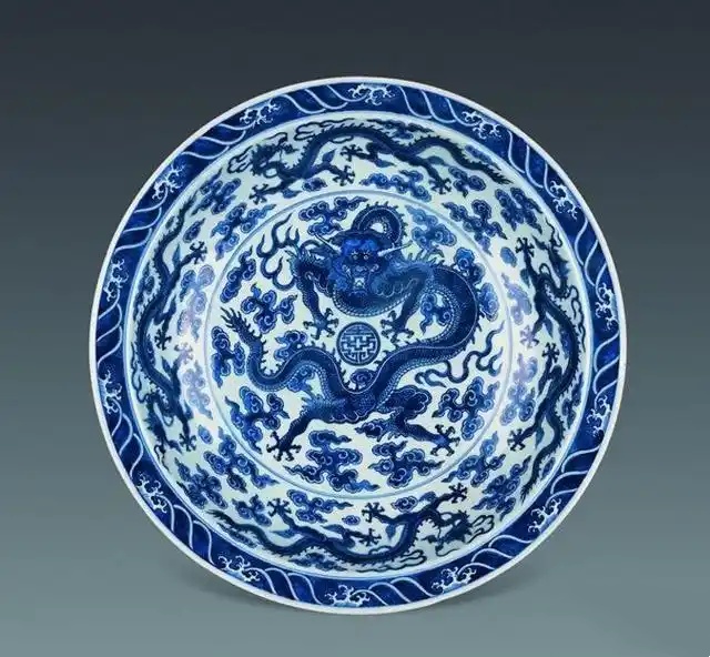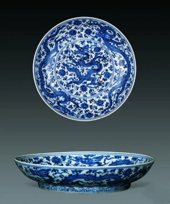 大盘是嘉靖官窑烧制的典型器物,有青花、黄釉青花、五彩、孔雀绿釉、孔雀蓝釉等品种。青花瓷是嘉靖时期的重要品种。清人《南窑笔记》品评嘉靖青花:“嘉窑料用回青,故浓翠红艳。多龙、凤、梵书、鱼、鸟、花样,但画工精重,不能比宣、成窑。”龙纹的描绘颇具时代风格,头呈三角形,龙嘴上颚比下颚长,鼻作如意形,状如猪嘴,俗称“猪嘴龙”,为嘉靖时期龙纹的典型形象。
