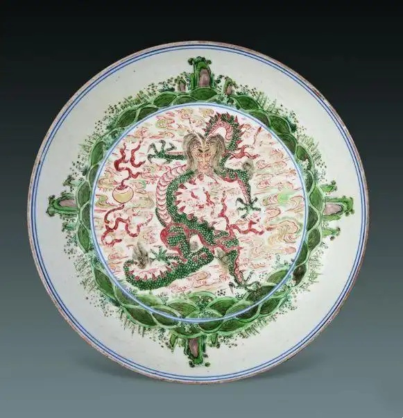 盘撇口,弧壁,塌底,圈足。内心与外壁均以白釉为地刻填绿彩云龙纹,外底青花双圈内书“大明弘治年制”六字双行楷书款。