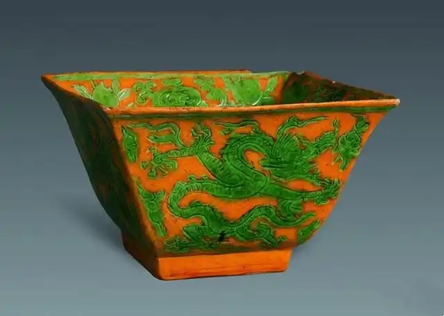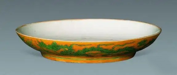 低温黄地绿彩瓷始创于明代永乐时期,宣德、弘治、正德、嘉靖朝均有烧造,其制作工艺先在坯胎上刻划纹样,纹饰上填低温铅绿釉,隙地填低温黄釉。正德黄釉绿彩瓷品种有盘、碗、高足碗等器型,多饰刻填云龙纹。
